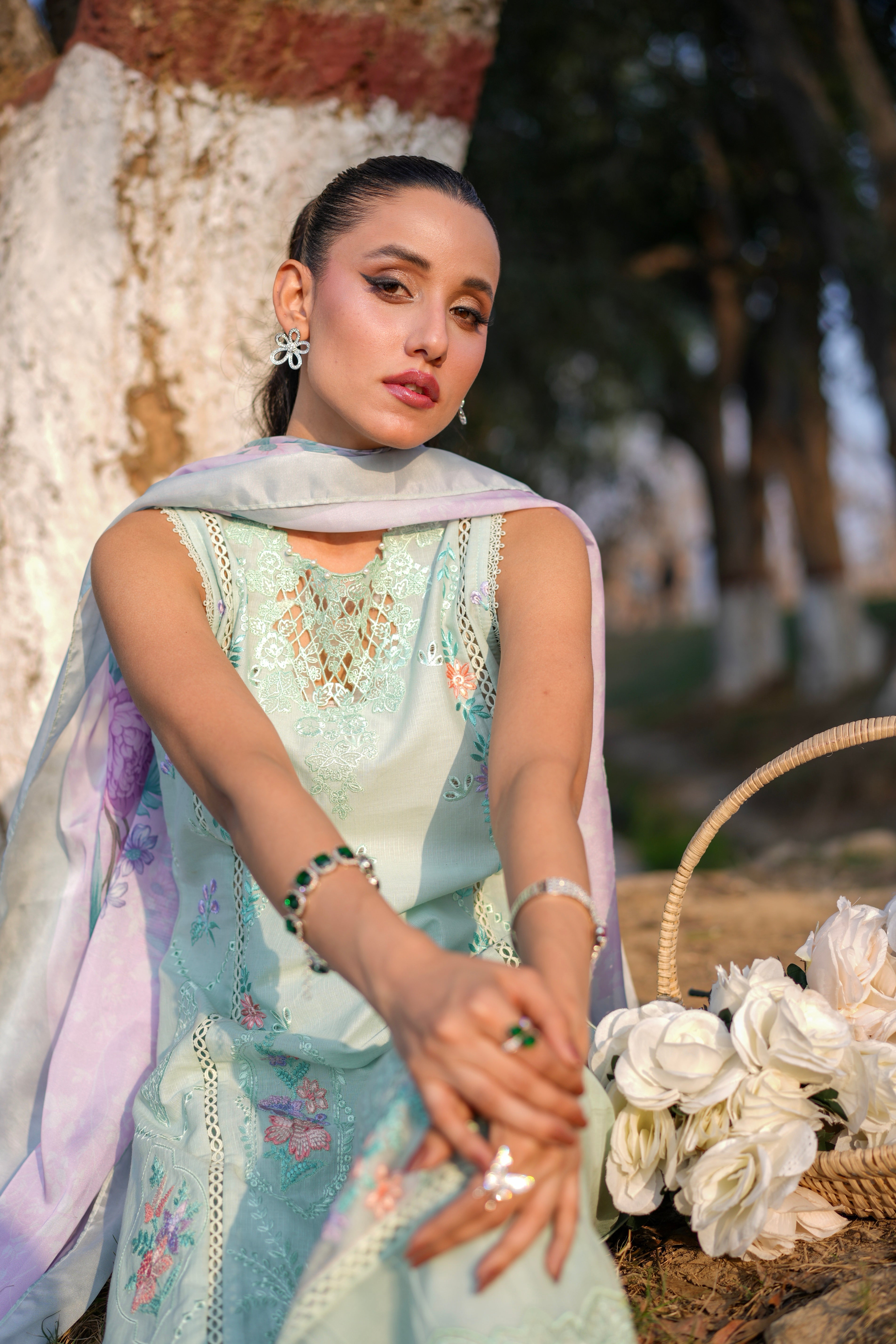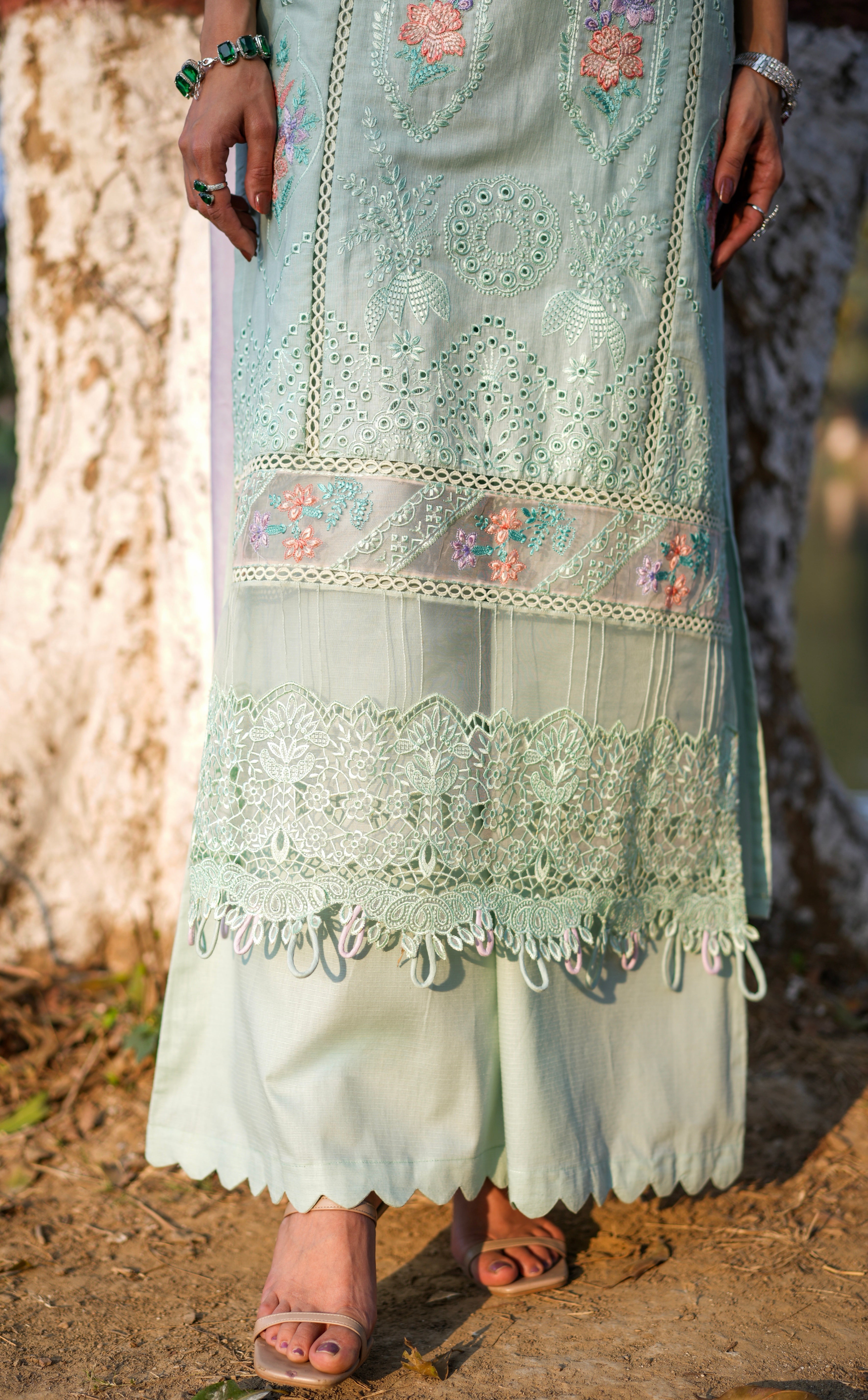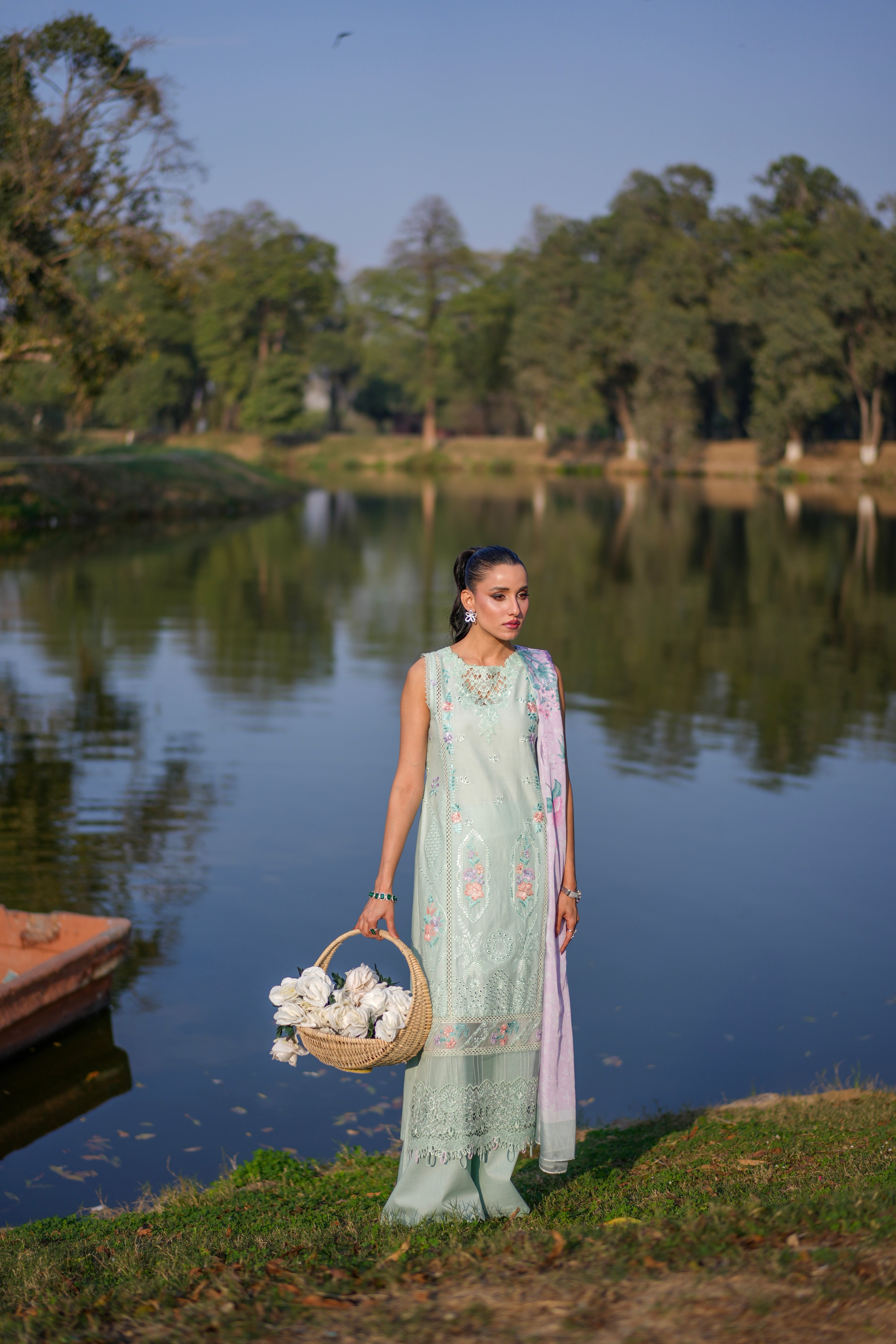 A mint-hued luxury lawn ensemble featuring an intricately embroidered shirt with self-embroidered panels with colourful motifs, paired with a matching trouser and a breezy digitally printed mediun silk dupatta. Light, graceful, and made for sunlit days.