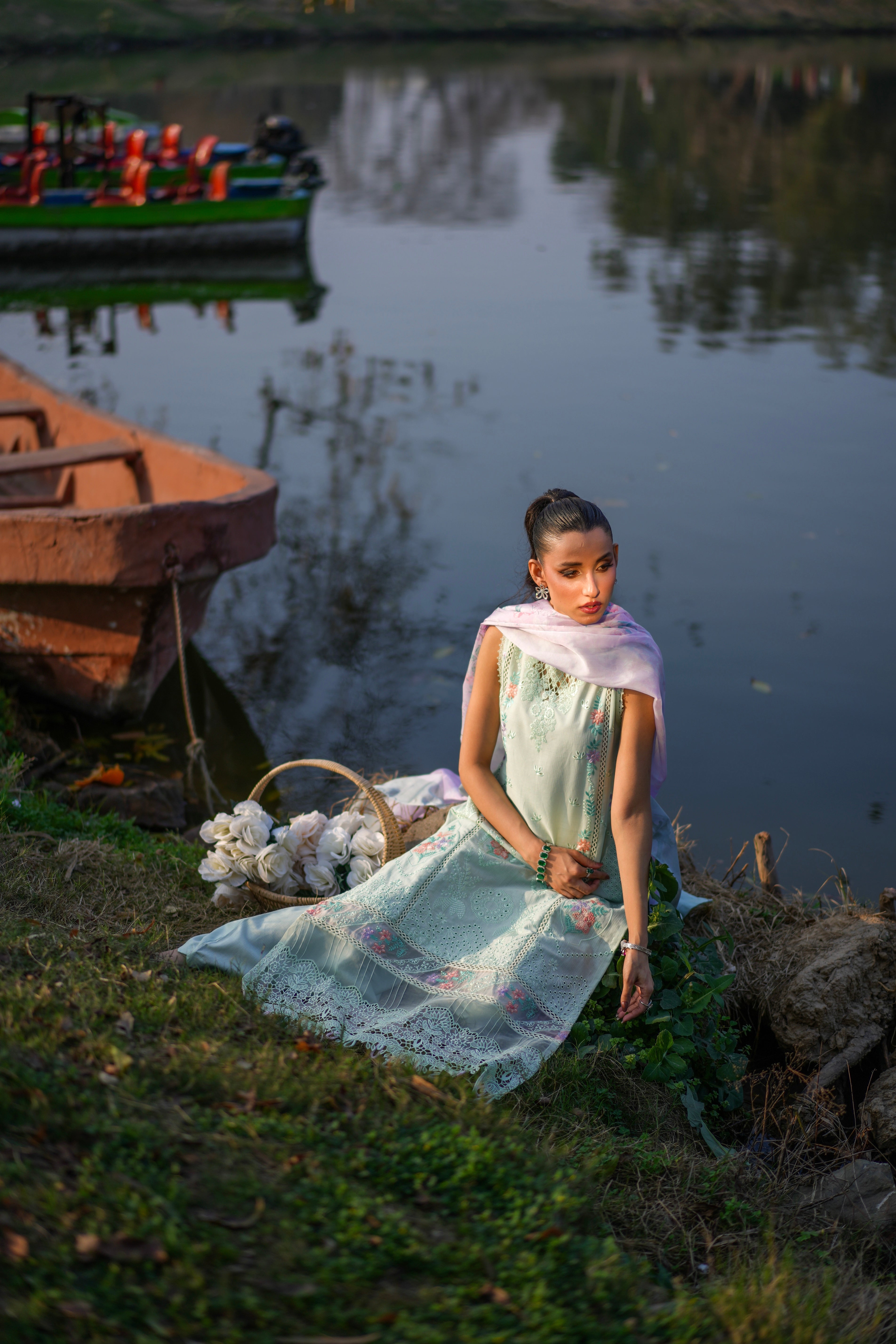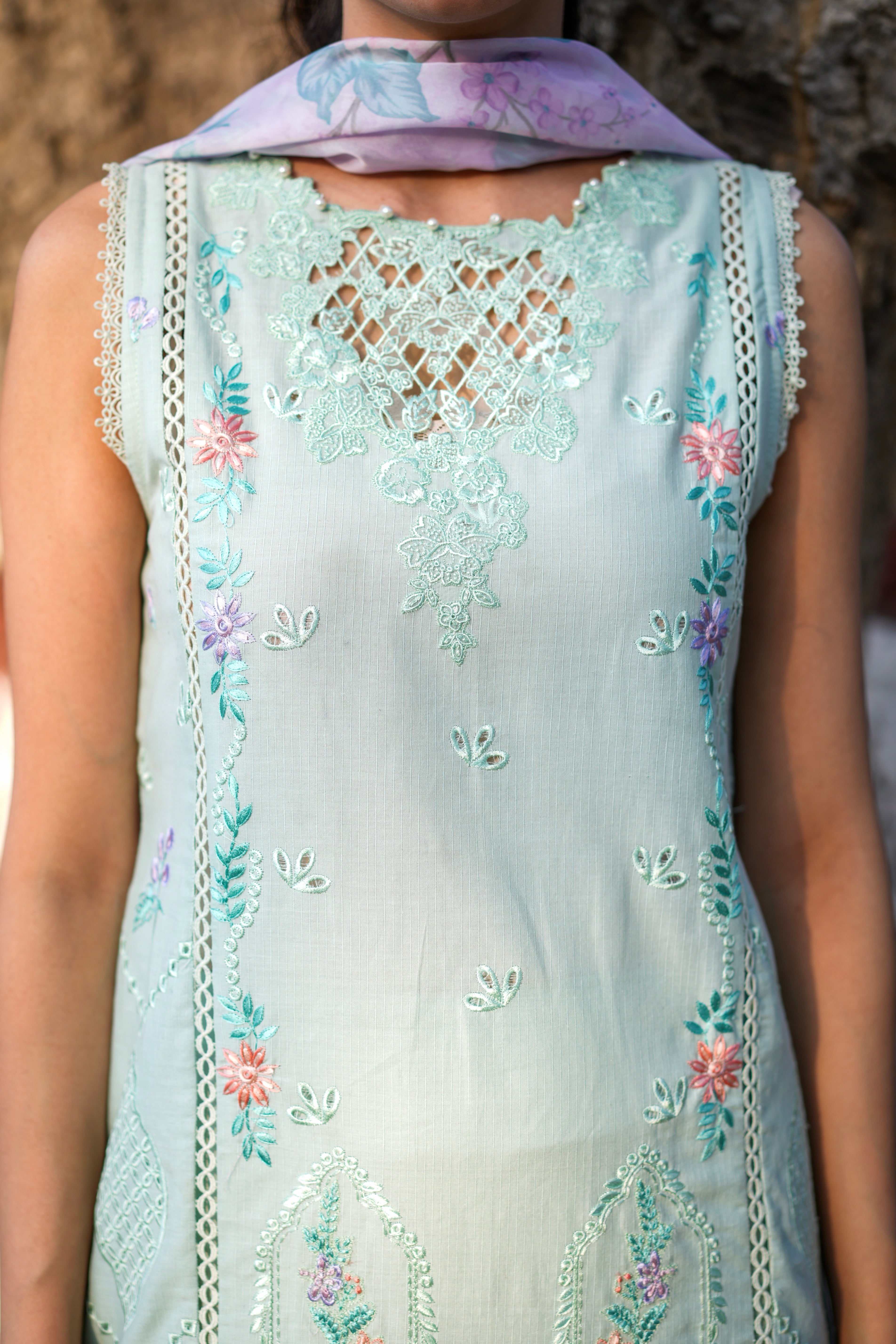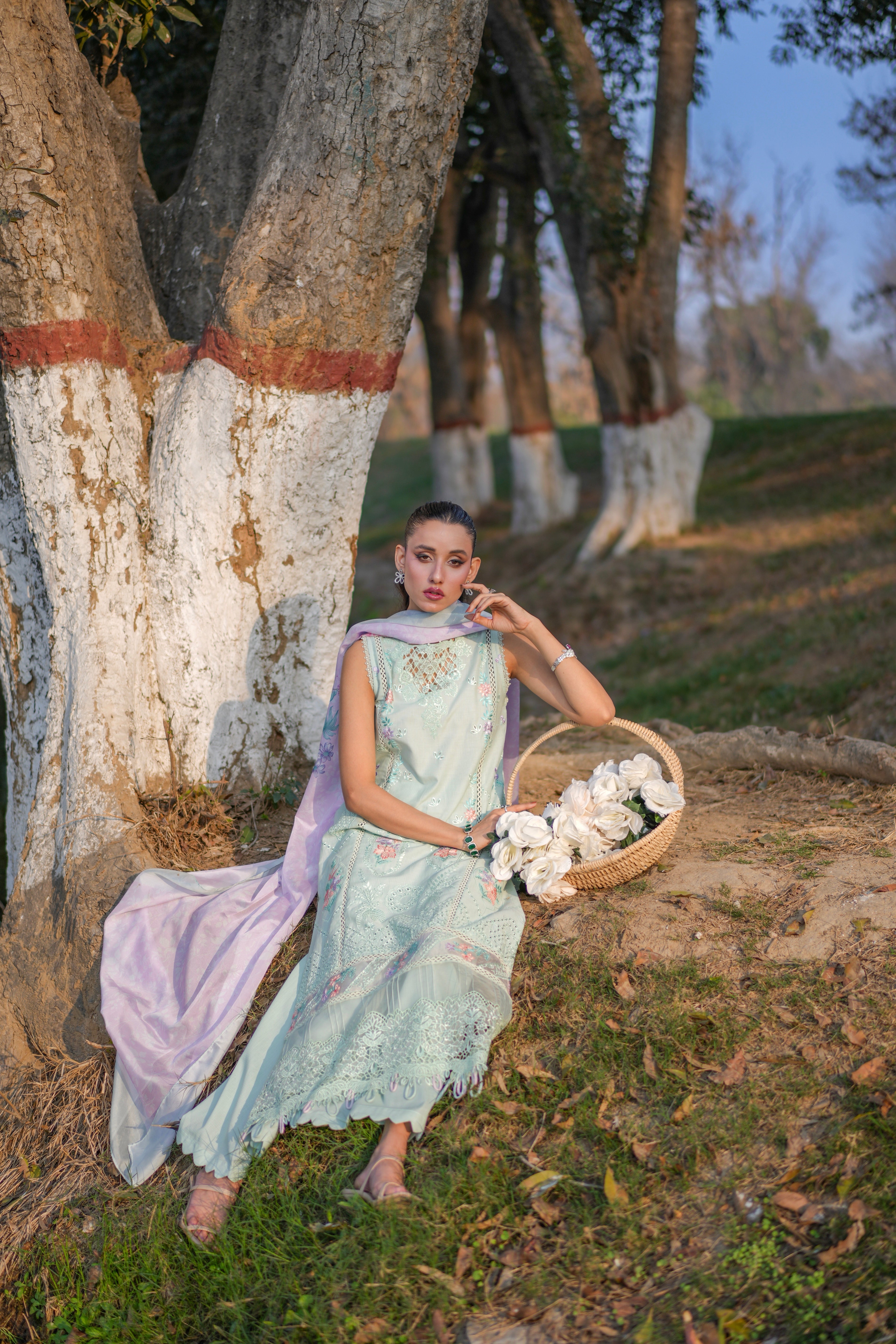 A mint-hued luxury lawn ensemble featuring an intricately embroidered shirt with self-embroidered panels with colourful motifs, paired with a matching trouser and a breezy digitally printed mediun silk dupatta. Light, graceful, and made for sunlit days.